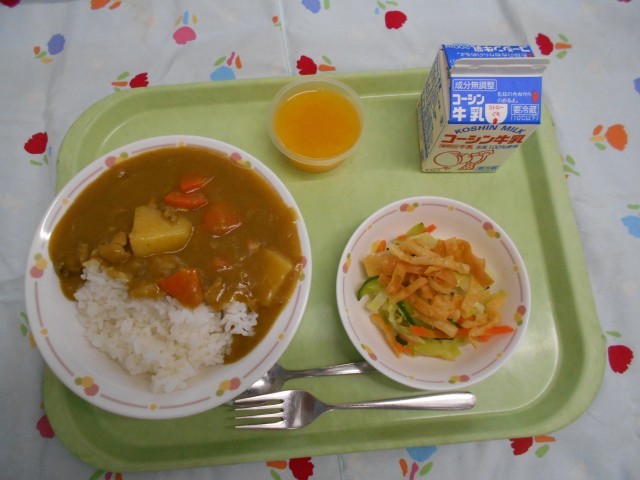 牛乳、チキンカレー、パリパリサラダ、オレンジゼリー
