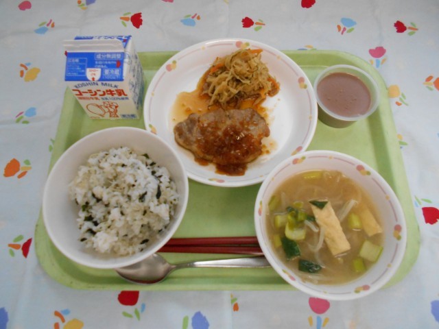 牛乳、わかめごはん、豚肉の香味焼き、切り干し大根の五目煮、みそ汁、ミルクココアゼリー
