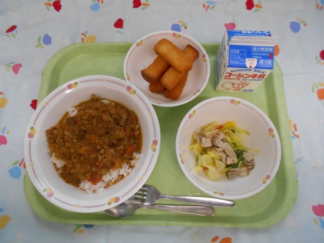 牛乳、キーマカレー、ベーコンサラダ、すれぃっく揚げパン
