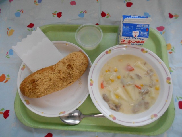 牛乳、きなこ揚げパン、コーンシチュー、サイダーゼリー、今日は2年生のリクエスト給食です。