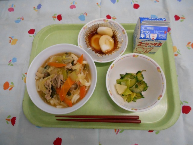 牛乳、みそ風味うどん、野菜の風味漬け、みたらし団子、今日はお彼岸献立です。