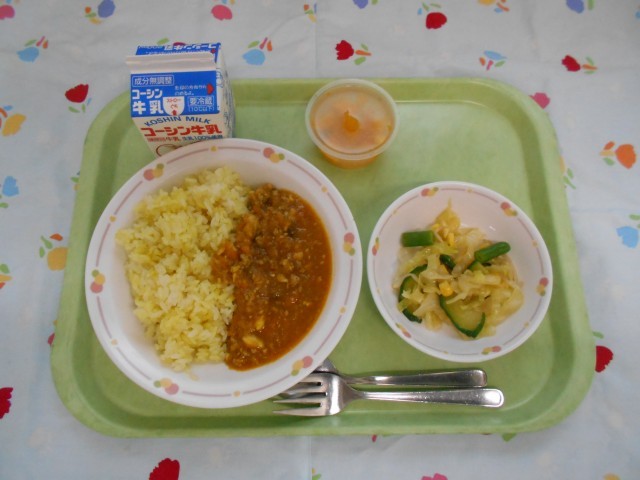 牛乳、大豆入りドライカレー、ボイル野菜、フルーツゼリー 今日は1年生のはじめての給食です。みんなよく食べていました。