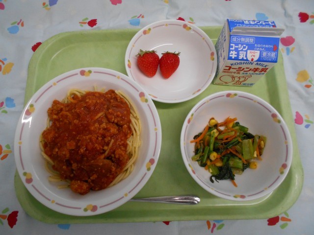 牛乳、スパゲティ ミートソース、小松菜のサラダ、イチゴ