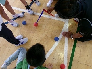 3年生の子供たちは、先生方に教えていただきながら実際にゲームをしました。みんなは真剣に取り組んでいましたが、勝負にこだわることなく競技を楽しんでいました。