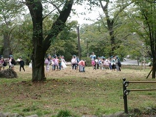 2年生と1年生のなかよし班で、飛鳥山公園にあきさがしに出かけました。公園では、秋を感じるものをビンゴカードに記録したり、おもちゃ作り用に集めたりします。活動の中心は2年生。リーダーとして1年生に声を掛けながら公園の中で班ごとに「さあ、出発!!」