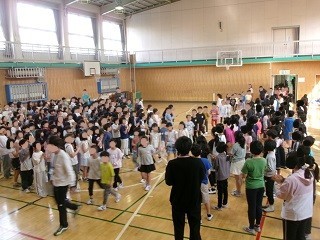 2年生から6年生までの子供たちが、初めて1年生を体育館に迎えて対面式を行いました。