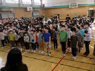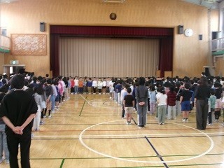 その後に、1年生も列に入って全員集合で朝会へ。