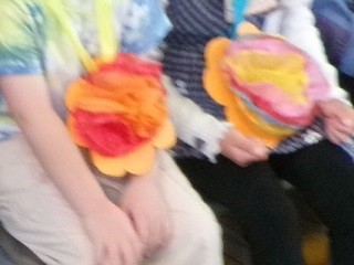 5年生の演奏に合わせて、6年生と一緒に1年生が入場しました。2年生が作ってくれたメダルを下げています。