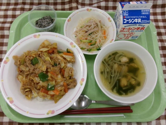ホイコーロー丼にはキャベツをたくさん使っていますが、キャベツは別で炒めてから最後に加えています。ひと手間ですがそうすることでシャキシャキとした食感でおいしく仕上がります。今日もどのクラスもよく食べていました♪