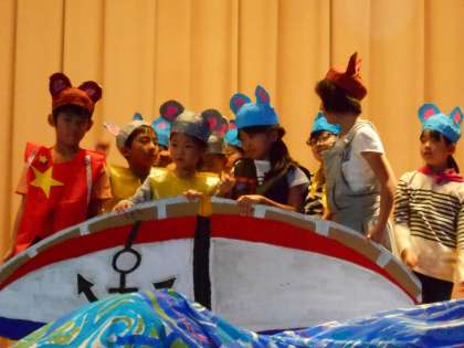 人間はどうしていじわるをしたくなってしまうんでしょうね…。一生懸命に演技をする子供達を見ていると、色々なことを考えてしまいます。最後は互いに「わかってくれれば、それでいいんだよ。」と、許し合いました。1年生らしい純真さが光る、良い劇でした。