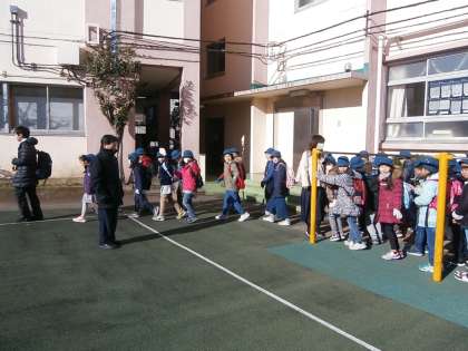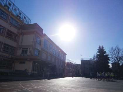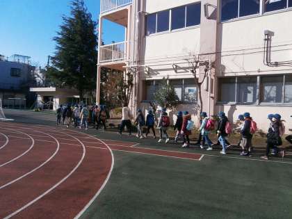 今朝は3年生が豊島消防署の見学に出かけました。寒い中ですが、校庭では5年生がサッカーの学習をしています。