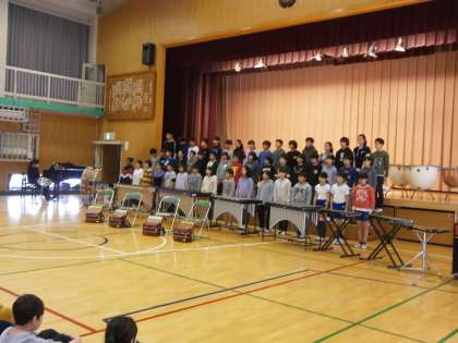 計画していた巣立ちの会も中止となりました。そこで披露するはずの歌と合奏を、急遽28日(金)5校時目の全校集会でお披露目してくれました。