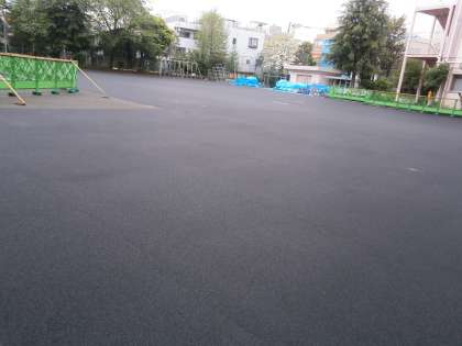 4月28日(火)午後から雷雨の予報に、朝から急ピッチで残りの4分の1のゴムチップ敷設を行っていただきました。ちょうど完了して片付けの時にポツポツ雨が降ってきました。その後はびっくりするほどの土砂降り!職人さん方が風邪をひかないかと心配です。今日で全面ゴムチップが敷かれました。校庭がピッカピカになっています。この後は、色を吹き付けてくださる予定です。仕上がりが楽しみです。