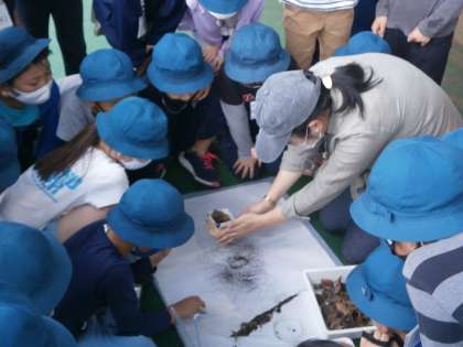 8月25日(火)、まだまだ暑いですが、「校庭から始める環境教育」の2回目授業を実施していただきました。今回は土の中の生き物と仲良くなろうというめあてで土をふるいにかけて観察を繰り返しました。はじめは「何にも居ない!」と言っていましたがだんだん目が慣れてきて小さな虫・動物を見つける「名人」が次々と出現しました。自然度の高いところにしかいないはずの「コウガイビル」を子どもたちが見つけて大騒ぎになっていました。講師の先生も「豊島区では2カ所目です」と驚いていらっしゃいました。