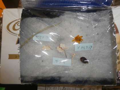 枯れたお花・育てていて亡くなってしまった昆虫、拾った素敵な石や木の実など、子どもたち一人一人の「宝物」がたくさん並んでいます。他の学年も通りすがっては一生懸命に見ています。都心にもいろいろな「自然」があるものです。