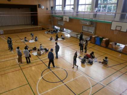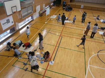 四年生は体育館で「地域安全マップ」を作成する様子を公開しています。子どもたちは先日学区内をタブレットで撮影しながら、今日のための資料を作成していました。