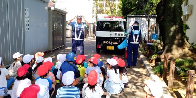 1年生に向けて、交通安全教室が行われました。巣鴨警察の方のお話を伺い、実際に外へ出て、注意事項を確かめながら歩きました。