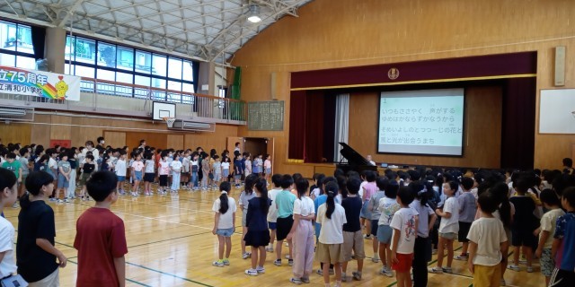 創立75周年に向けて、豊島区民の歌「としま未来へ」を音楽朝会で歌いました。全校の歌声がとても素敵になりました。