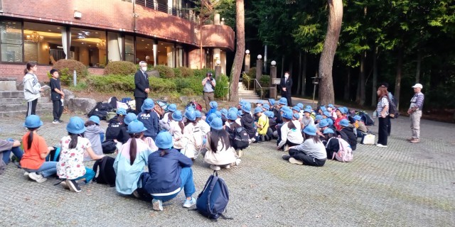 山中湖の湖畔で写真を撮った後、秀山荘に到着しました。開校式では、お世話になる宿舎の方に、ご挨拶をしました。宿舎の方からは、部屋での過ごし方についてのお話をいただきました。バスの運転手さんやガイドさんにも1日大変お世話になりました。子供たちは、バスの乗降の際にしっかりと挨拶をしていました。