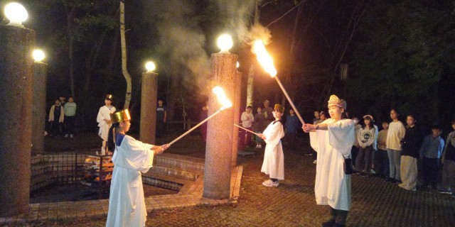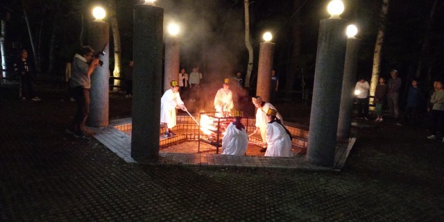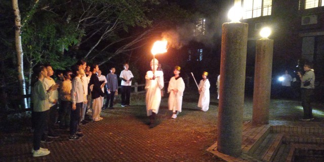 キャンプファイアーを行いました。「遠き山に日は落ちて」の歌声の中、5年生全員の誓いの言葉「責任」「協力」「友情」「希望」のもと、点火をしました。
