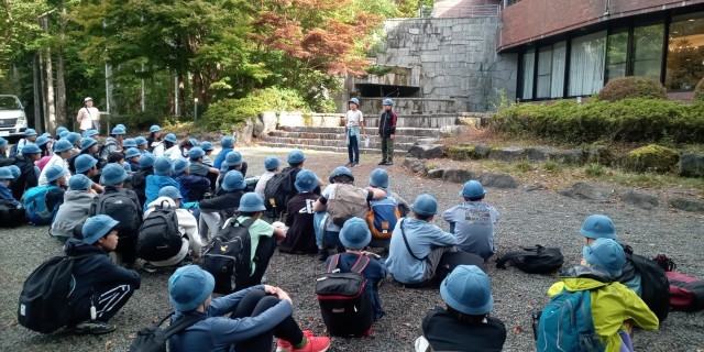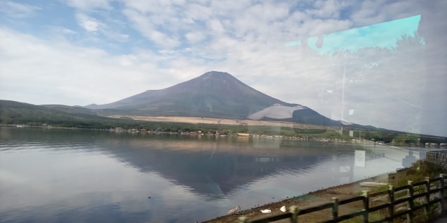 閉校式では、お世話になった宿舎の皆さんに感謝の気持ちをお伝えしました。バスに荷物をのせて、鳴沢風穴に向かっています。山中湖から富士山が見事に見えました。