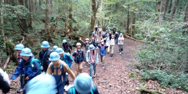 青木ケ原樹海をハイキングしました。青木ケ原樹海は、約1200年前の噴火で流れ出た溶岩の上に形成され、針葉樹と広葉樹が密生しています。安全な遊歩道を歩きました。