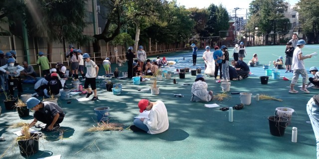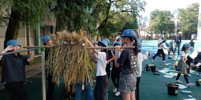 先週、5年生は大塚ろう学校の5年生と一緒に稲刈りをしました。今年は、ネズミが稲をかじって収穫が半分位になったということでした。それでも、収穫できてよかったです。