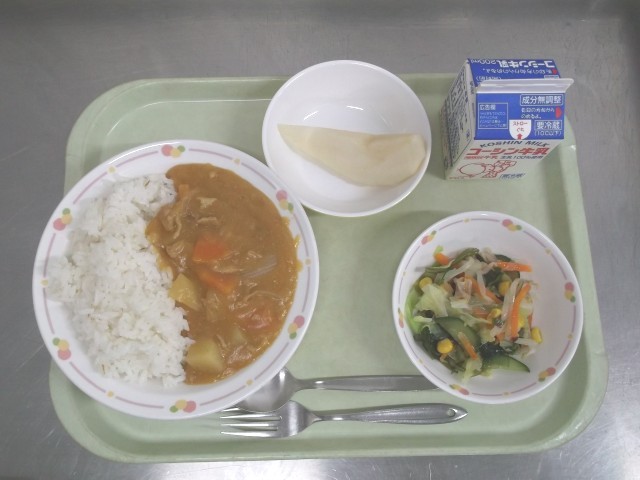 今日のくだものは山形県産の洋梨です。洋梨は9~11月頃が旬のくだもので、和梨よりも軟らかく、香りが強いのが特徴です。今日は、マルゲリット・マリーラという、サイズの大きな品種の洋梨でした。