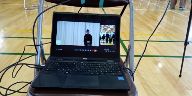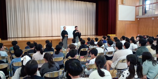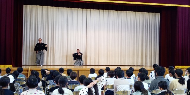 東京都の「子供のための伝統文化、芸能体験事業」が、本校体育館で開催されました。狂言を野口隆行さん、奥津健太郎さんに教えていただきました。プロの方による演技や声など、とても素晴らしかったです。この学習は、フレンドスクールの秋田県能代市立浅内小学校に同時に配信され、一緒に学んでいました。