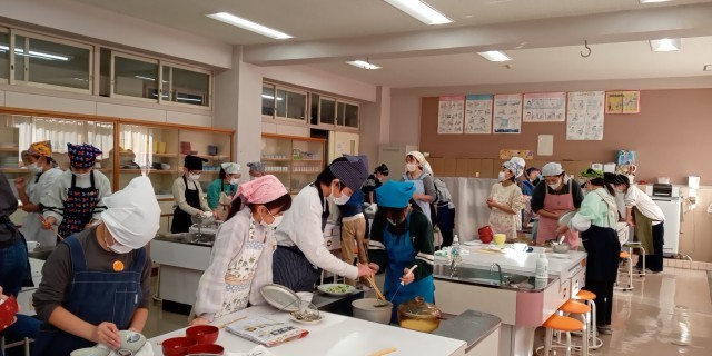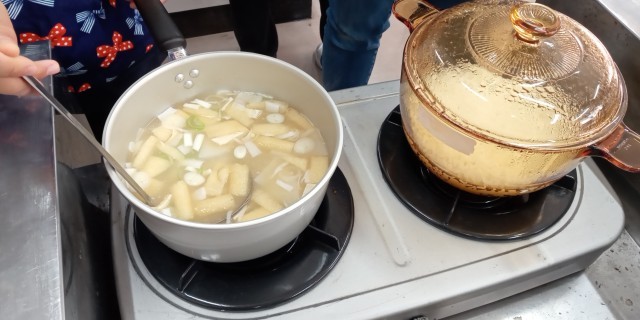 家庭科5年生の調理実習で、ご飯とみそ汁を作りました。ご飯は透明な鍋で、炊きあがる様子を見ました。みそ汁は、煮干しから出しを取り、大根、油揚げ、ネギの入ったみそ汁を作りました。子供たちは、協力して調理実習を行っていました。保護者の方にもお手伝いいただきました。