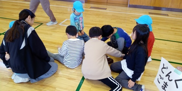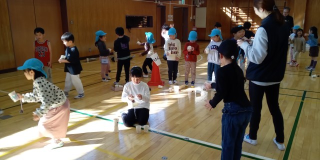 1年生は、「秋のおもちゃランドで遊ぼう」を行いました。保育園を招待して、自分たちが作ったおもちゃで一緒に遊びました。