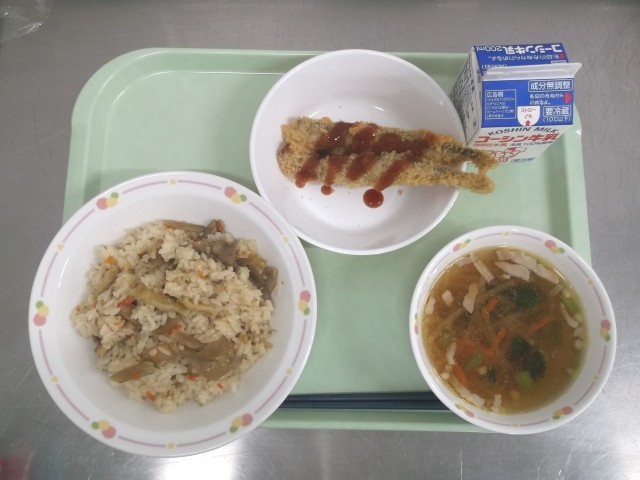 まいたけ等のきのこやごぼうには「食物繊維」が多く含まれています。食物繊維は、腸の調子を整えて便通をよくする、糖尿病や高血圧などの生活習慣病、大腸がんを予防する等の働きがあります。きのこや海藻、納豆、麦、ごぼう、こんにゃく、さつまいもなどに多く含まれています。給食では食物繊維の多い食品を積極的に使っています。