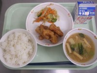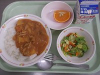 今日から3学期の給食が始まりました。最初の献立は、玉ねぎをじっくり炒めて作るキーマカレーです。ターメリックというスパイスを入れて炊いたご飯にかけていただきます。くだものは、青森県産のりんごです。