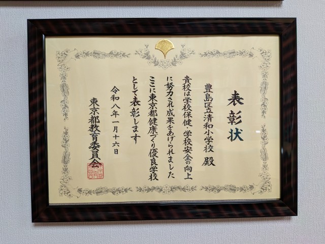 先日、都庁で、令和7年度東京都教育委員会表彰(健康づくり功労)表彰式が開催されました。本校は、令和7年度に、健康づくりにおいて、活動が認められて表彰されました。校長が代表で表彰式に出席し、賞状をいただいてまいりました。ありがとうございました。
