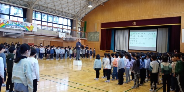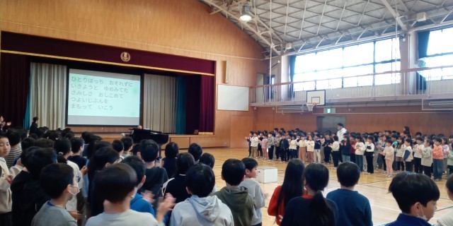 音楽朝会で「カントリーロード」を歌いました。全校児童の声が合わさり素敵な歌声になりました。