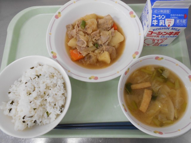 今日の献立「わかめご飯・肉じゃが・かぶと春キャベツの味噌汁・牛乳」