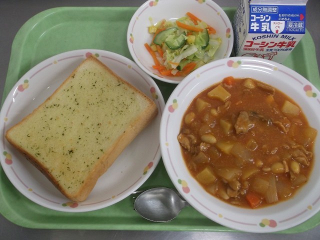 今日の献立「ガーリックトースト・ポークビーンズ・フレンチサラダ・牛乳」
