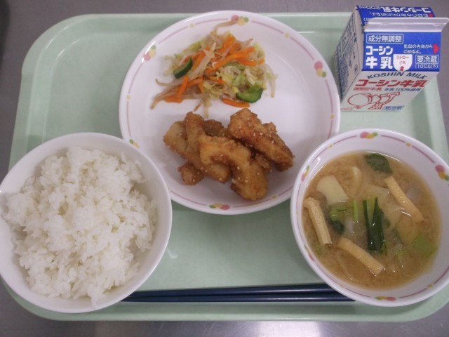 今日の献立「ごはん・いかの甘辛揚げ・野菜の生姜醤油和え・新じゃがいもの味噌汁・牛乳」
