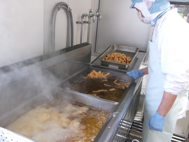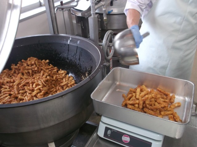 今日は、いかの短冊切りに片栗粉をつけて揚げ、給食室手作りの甘辛ダレとごまをからめました。