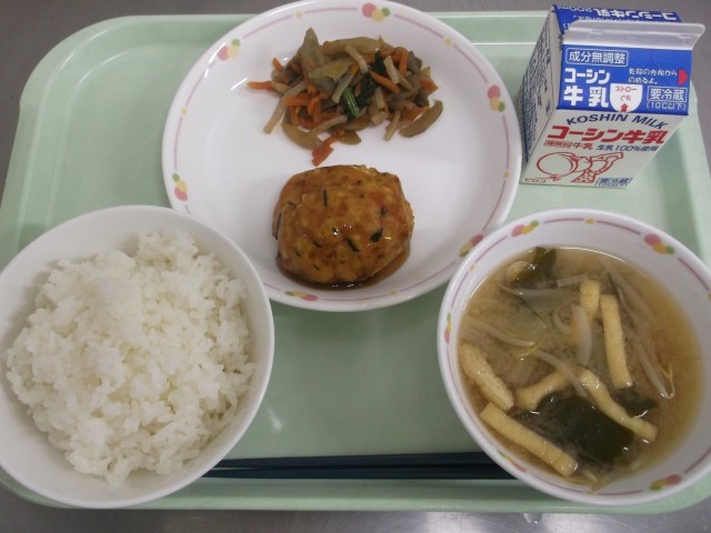 今日の献立「ごはん・豆腐ハンバーグ・五目きんぴら・新玉ねぎとわかめの味噌汁・牛乳」