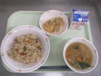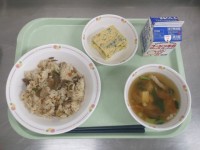 9月19日(金)牛乳舞茸とごぼうのごはん五目卵焼き沢煮椀 鶏ひき肉やにんじん、ほ...