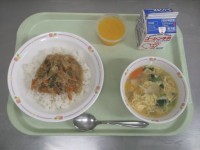 7月15日(火)牛乳チンジャオロースー丼蒸しとうもろこしビーフンスープ 今日は2...