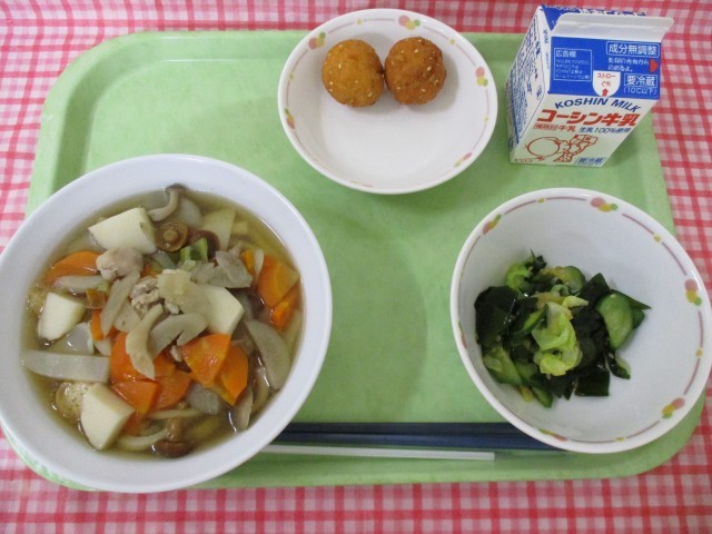 今日の給食のドーナツにはおからが入っています。おからは、豆腐を作るときに大豆から豆乳をしぼったあとのしぼりかすです。大豆の栄養がぎゅっとつまっていて、からだをつくるたんぱく質や、おなかの調子を整える食物繊維がたくさん含まれています。