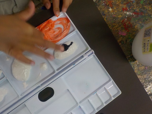 絵の具を指で混ぜて、黒い画用紙に指で描きました。