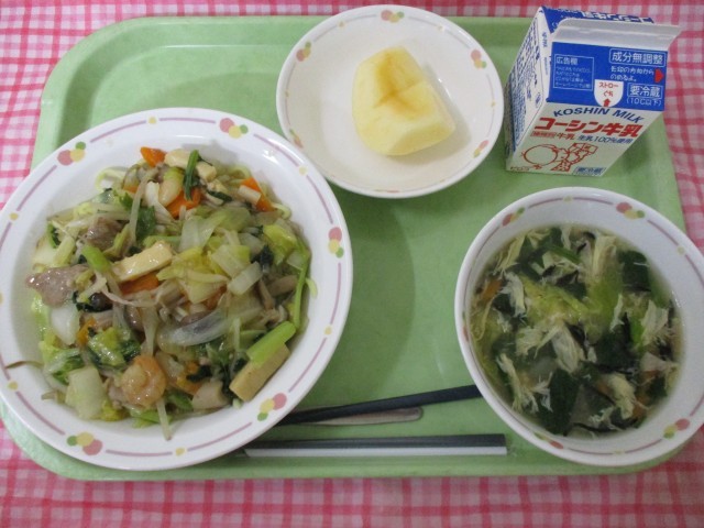 八宝麺の「八」には”具だくさん”という意味があります。今日の給食の八宝麺には、豚肉・えび・いか・はくさい・にんじん・もやし・こまつな・しょうが・にんにくが入っています。一度にたんぱく質やビタミンなどの栄養素を摂ることができるメニューです。