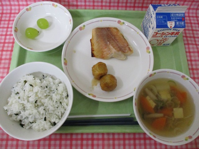 今日の果物は、山形県産のシャインマスカットです。シャインマスカットといえば、エメラルドグリーンで綺麗な見た目のイメージがありますが、緑色のシャインマスカットはまだ若い状態で、熟すにつれて徐々に黄色やオレンジ色になってきます。緑の粒がシャキッとした食感でさっぱりした甘さなのに対して、黄色い粒はやわらかく、濃厚な甘みが特徴です。