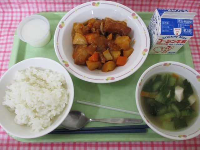 酢豚は、名前の通り、調味料の酢と豚肉を使った料理です。今日は豚肉以外にじゃがいも、にんじん、ピーマン、たまねぎ、エリンギ、しめじを入れて具だくさんにしました。