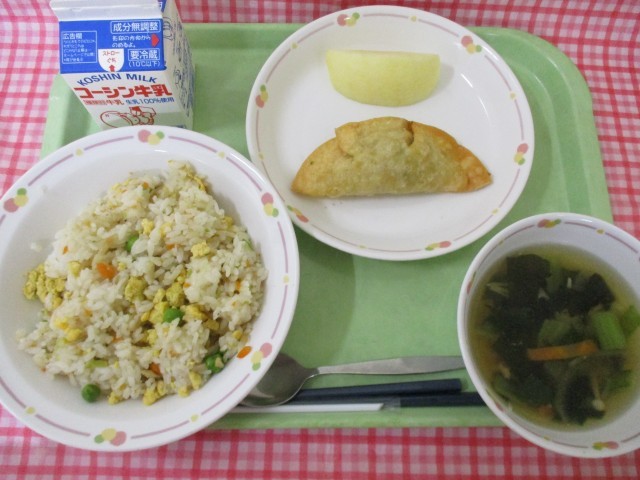 今日の給食の主菜は、揚げぎょうざでした。餃子の皮の大きさは13cmのものを使っているので、スーパーなどに売っている皮よりも大きいです。豚肉やねぎ、キャベツ、にらなどを入れて具だくさんにしました。