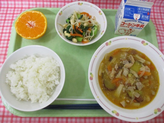 「タッカルビ」は鶏肉と野菜を甘辛く炒め煮にした韓国・朝鮮の料理です。「タッ」は「鶏」、「カルビ」は「あばら骨」のことで、骨のまわりの肉を食べるという意味です。今日は鶏肉とにんじん・たまねぎなどの野菜とさつまいもをコチジャン