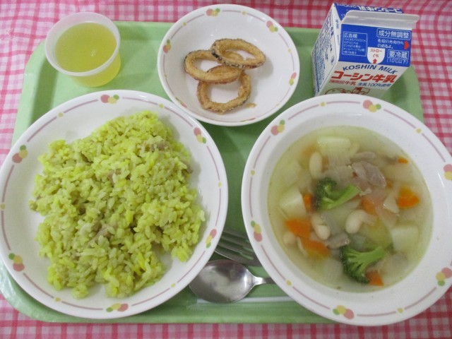 ビリヤニは、香り豊かなインドの細長いお米”バスマティライス”とスパイスを一緒に炊き上げた料理です。給食では日本のお米で作りました。松茸ごはん、パエリアと並び世界三大炊き込みごはんの一つともいわれています。